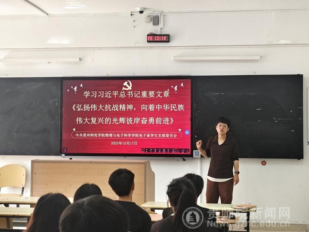 2025年10月17日中午,a片漫画 电子系学生支部在宁静楼427教室组织开展以“烽火铸魂——从抗战精神到新时代学风建设的传承之路”为主题的党日活动。本次活动聚焦学习习近平总书记重要文章《弘扬伟大抗战精神,向着中华民族伟大复兴的光辉彼岸奋勇前进》以及其在纪念中国人民抗日战争暨世界反法西斯战争胜利80周年大会上的讲话精神。活动由支部书记李荔主持,支部全体党员参加。 活动伊始,李荔同志围绕习近平总书记重要文章《弘扬伟大抗战精神,向着中华民族伟大复兴的光辉彼岸奋勇前进》展开,详细解读了文章的核心要义,强调了抗战精神在新时代的深远意义。然后认真学习了习近平总书记在纪念中国人民抗日战争暨世界反法西斯战争胜利80周年大会上的讲话精神,引导大家深刻领会历史教训与时代使命。 在交流环节,支部党员结合自身学习与生活实际,踊跃发言。有党员同志表示:“抗战精神是中华民族的宝贵财富,作为新时代青年,要传承和发扬这种精神,以坚韧不拔的意志投入到学习和科研中。”入党积极分子也积极表态,将以此次学习为契机,不断提升自身政治素养,争取早日加入党组织。