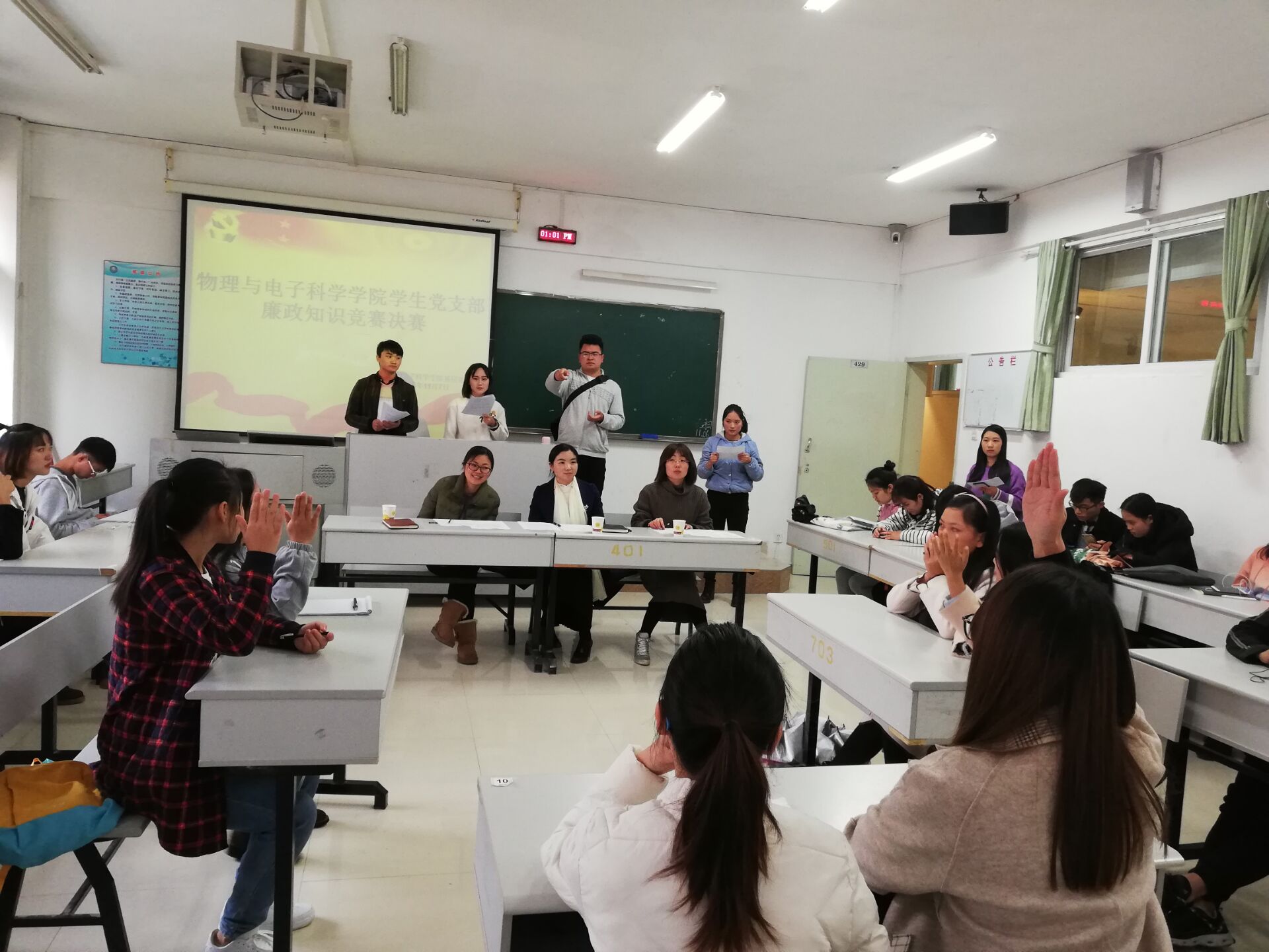 为学习贯彻好十九大精神,增强队伍党性修养及廉洁意识。a片漫画 党委经研究决定,于2018年11月6日和7日分别在宁静楼437、429教室开展“廉政文化知识竞赛“初赛及决赛。决赛由物电学院党委副书记何毅、物理系党支部书记楚亚萍及组织员张海蓉担任评委。 凭借对廉政知识的深入学习和深刻领会,在6日的笔试初赛中,参赛者表现出了高度的组织纪律性,答题效果也十分理想,更是出现了满分答卷。通过初赛的比拼,李娜等六名参赛者成功脱颖而出进入决赛。决赛首先由三位评委分别做动员讲话。经过必答题环节的小试身手,参赛者在抢答题环节逐渐开始崭露头角;对于主持人宣读的一个个题目,他们不仅抢得快,更答得准,答得好。随后的论述题环节,在陈思丽对伟大斗争、伟大工程、伟大事业、伟大梦想深入明了的解读下,全场爆发出热烈的掌声。 何毅对大赛做总结讲话时强调,大家一定要自发、主动的在生活中深刻学习党政廉洁知识,提升自身社会主义思想觉悟。她指出:“新的历史时期,全体青年大学生要深入学习贯彻习近平新时代中国特色社会主义思想,牢牢把握四个意识,争做有为青年!” (文/图 熊贇华 韦婷 楚亚萍 审核/何毅)