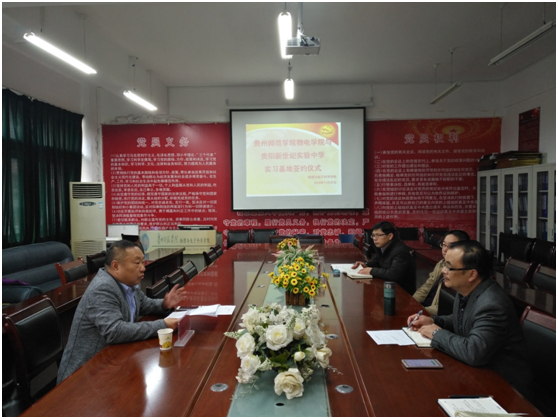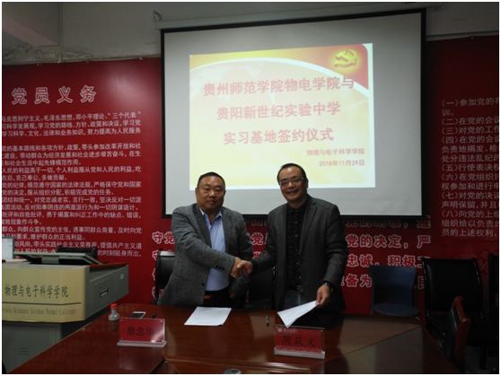 2018年11月29日,物电学院在宁静楼419会议室同贵州省贵阳市新世纪实验中学进行实习基地洽谈签约,参会人员有贵州省贵阳市新世纪实验中学詹忠华校长,物电学院周筑文院长、院长助理刘高福、办公室主任向坤、前督导许红斌老师,洽谈会由周筑文院长主持。 为了实现学校的“一型两性一化”的办学定位,“以本为本”和推进“四个回归”,以师范生“一践行三学会”为核心的培养目标,物电学院积极拓展应用型人才实践实习基地,特邀请贵阳新世纪实验中学詹忠华校长到学院商讨实习基地事宜。为实现教育资源的共享和提高双方的合作质量,本着互惠互利的原则,经友好协商,双方就实习基地建设提出了合作意向,交流了具体合作细节,达成长期合作,贵阳新世纪实验中学达成每年接收10名物理师范专业实习生,为物理学师范专业提供了良好的教学实践条件,最后,在师生的见证下双方签署了共建教育实践基地协议书。希望该实习基地能够成为a片漫画物理教育教学质量提升重要实践基地之一。 (文/图 向坤 审核/周筑文)
