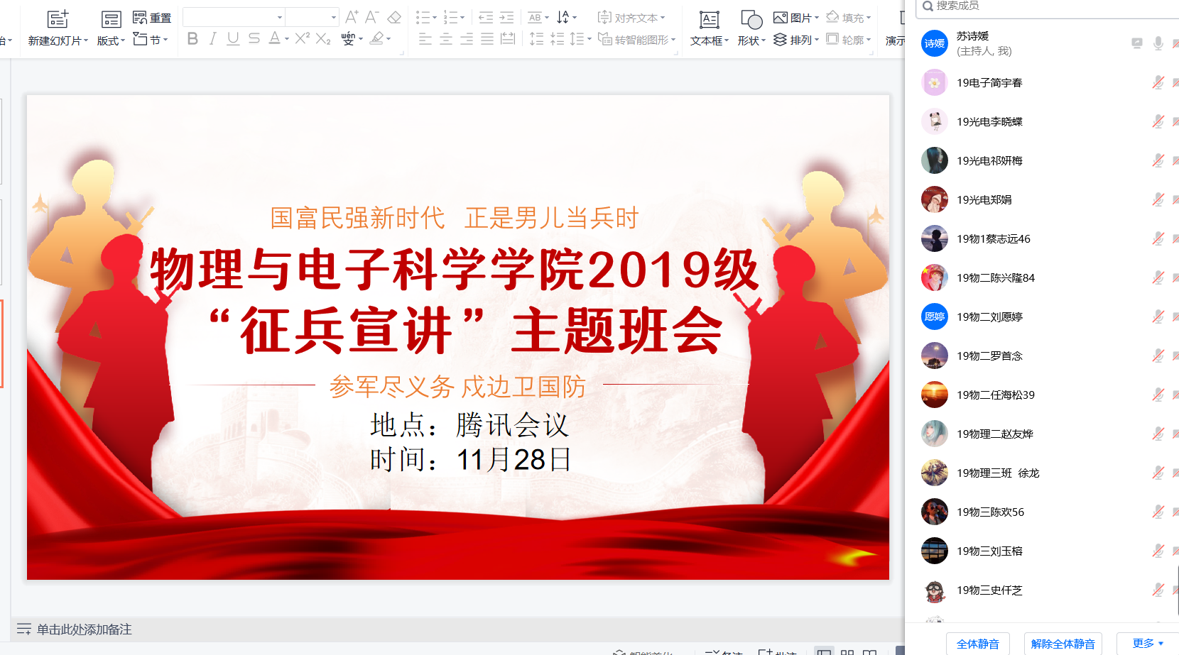 为全面贯彻习近平新时代中国特色社会主义思想,深入贯彻习近平强军思想,以高度的政治责任感和使命感学习宣传贯彻党的二十大精神,坚持人才强军,扎实开展国防教育工作,努力为国防事业输送更多优质兵员,物电学院毕业班班主任苏诗媛组织19级全体学生开展“青春礼赞二十大 强军有我新征程”国防教育线上主题班会。 班会上,苏诗媛首先带领全体学生学习了《高举中国特色社会主义伟大旗帜 为全面建设社会主义现代化国家而团结奋斗——在中国共产党第二十次全国代表大会上的报告》;紧接着,学习了《中华人民共和国兵役法(2021年修订版)》《中华人民共和国退役军人保障法》等国防法规;然后对普通高校学生就业政策、应征入伍政策公告、贵州省征兵工作优抚办法、乌当区征兵优抚办法、a片漫画 在校学生应征入伍优抚办法、应征入伍前置招聘等相关内容进行讲解。 最后介绍了大学生兵员征集条件、入伍流程等相关内容,并对同学们的应征入伍问题给与解答。 2023年,是学习贯彻党的二十大精神,深化国防动员体制改革的重要一年,做好征兵工作意义重大、责任重大。希望青年学子响应祖国号召,积极到部队中锻造成长,把聪明才智融入强军梦想,用青春年华谱写壮美人生篇章。