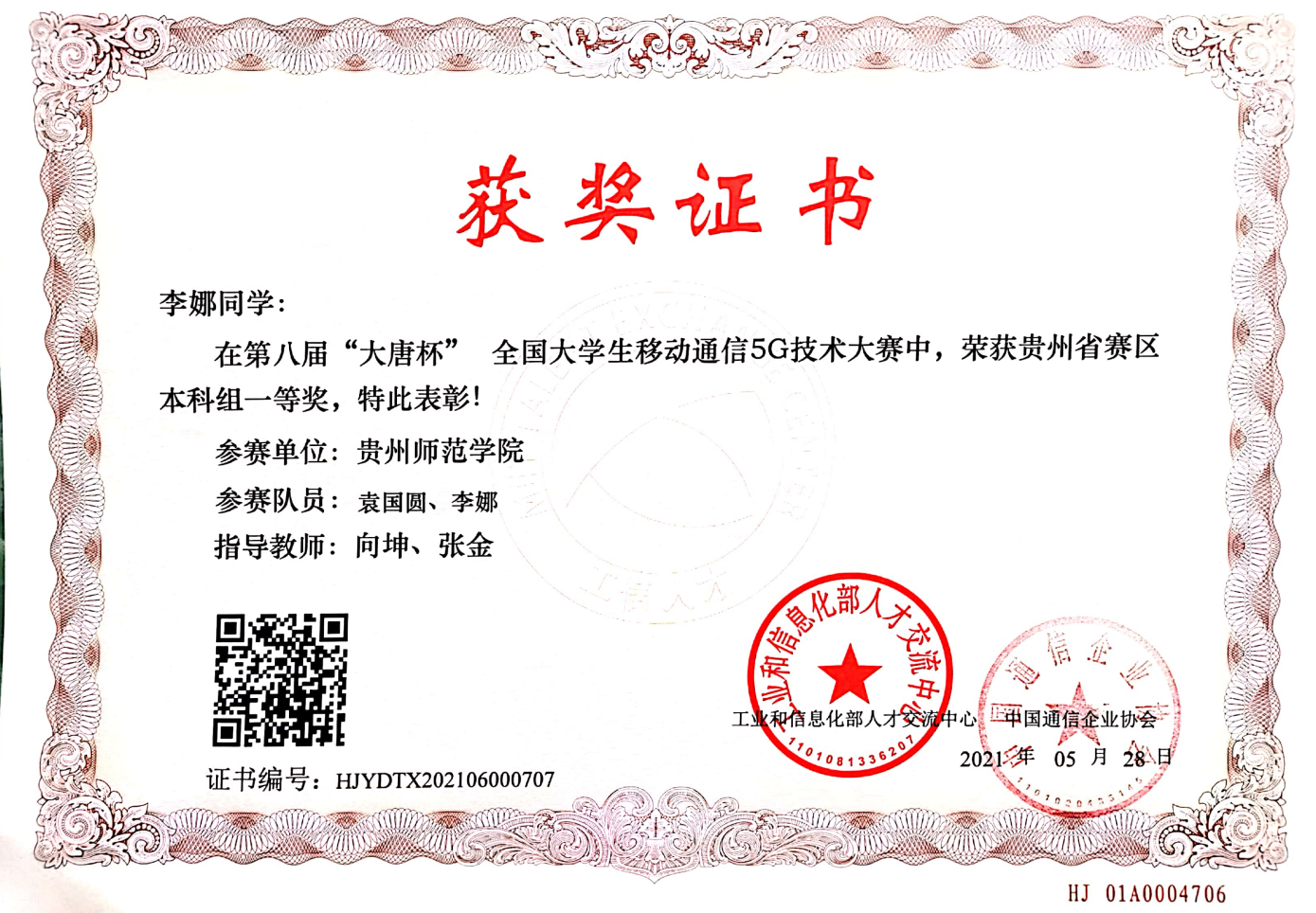 6月26日,全国普通高校学科竞赛中的第八届“大唐杯”全国大学生移动通信5G技术大赛全国总决赛在北京工业大学举行。我校代表队在物电学院李荔老师的带队下参加了此次总决赛。 本次大赛由国家工业和信息化部、中国通信企业协会主办,大唐移动通信设备有限公司、北京市教委北京高校电子信息类专业群承办,北京工业大学、北京邮电大学协办。此次赛事覆盖全国30个省市自治区,300余所院校参加,包含了哈尔滨工业大学、国防科技大学、武汉大学、电子科技大学、兰州大学等多所985和211建设院校约1700余名师生参加本次总决赛。大赛筹备期间,物电学院党委书记熊德永以及学院办公室主任向坤老师与大唐移动集团张金工程师对电子信息类专业的李娜、袁国圆、邓先慧、林能4名学生进行了精心指导和综合培训,经过学生们三个月的不懈努力,5月份参加了贵州省选拔赛,并荣获省级一等奖和省级二等奖。最终李娜、袁国圆组合更是顺利通过省级选拔赛参加了北京工业大学的总决赛,赛场上,选手们沉着冷静,团结协作,与各校优秀学子同台竞技,通过理论与应用的交流学习,提升了学生的专业、科学素养,培养了他们的创新能力和实践能力,为5G通信高端人才的输出打下坚实基础。