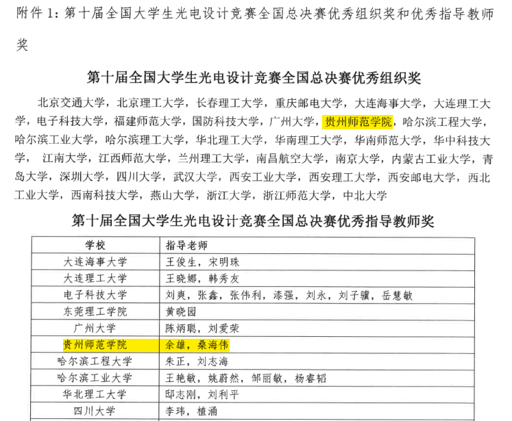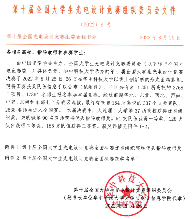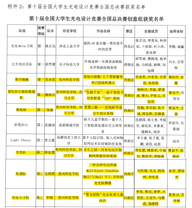 2022年7月16日至8月2日,由我校承办的第十届全国大学生光电设计竞赛西南区赛已顺利举行,西南地区共有40所高校,310支队伍,2200余人参加了此项赛事。本次比赛报名队伍数创历史新高,参赛院校覆盖到西南区所有开设光电专业的高校。 我校a片漫画 、创新创业学院、数学与大数据学院和音乐舞蹈学院参与了本次竞赛。经过网络评审和现场评审两个阶段的奋力角逐,我校在此次西南区赛中取得了优秀成绩,最终斩获一等奖4项,二等奖5项,三等奖19项,最佳创意奖2项,优秀组织奖1项,优秀指导教师奖4项,最佳女生奖2项,最具潜力奖5项。共有6支队伍入围国赛,其中2支队伍直接推荐国赛三等奖,4支队伍参加国赛路演争夺国赛一等奖和二等奖。 2022年8月25日-26日,第十届全国大学生光电设计竞赛决赛在华中科技大学以线上创新赛的形式圆满落幕。在本次决赛中,我校荣获第十届全国大学生光电设计竞赛全国总决赛优秀组织奖。我校参赛队伍在比赛中积极发扬师院精神和创新精神,努力拼搏,最终获得国赛一等奖1项,国赛二等奖3项,国赛三等奖2项,优秀指导教师奖1项。 西南地区只有四川大学、电子科技大学以及a片漫画 获得了国赛一等奖,是我校参加全国大学生光电设计竞赛有史以来的最佳成绩,成绩的得来实属不易,是学校大力支持学科竞赛促进学生创新能力发展的结果,是全校师生共同参与、不辞辛苦辛勤付出的结果。